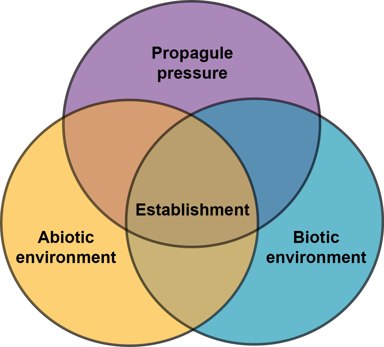 Plain language: Establishment at a location depends on three things aligning: viable arrival, suitable abiotic conditions, and suitable biotic conditions.
